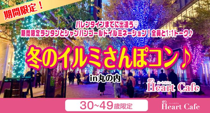 1月9日更新開催決定女性残り3枠男性残り3枠出逢いもイルミも楽しめる観光しながら出逢える新しい婚活恋活イベントお散歩コンでおなじみハートカフェがアテンドします今回のおでかけ先はイルミの宝庫丸の内エリアです。今だけのイルミネーションが見たい1対1でお相手と話したい初対面での会話に自信がないから、話題があると安心堅苦しい婚活パーティーは苦手自然な雰囲気で出逢いたいイベント終了後は気になる人とゆっくり食事したり、2次会に行きたいそんなあなたにおすすめお散歩企画ですルートはスタッフにお任せ当日の参加人数や...