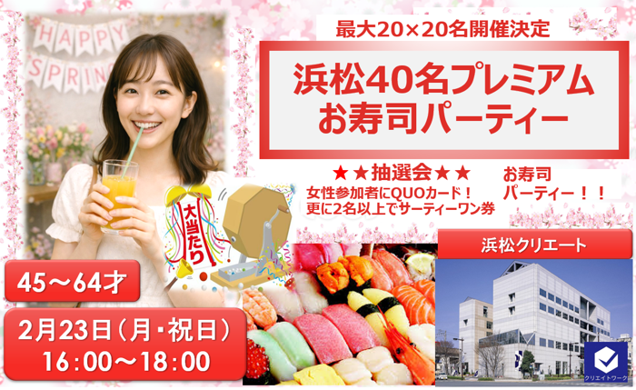 【浜松40名プレミアムパーティー(45~64才)】お寿司・豪華抽選会&女性QUOカード1000円分(早期お申込特典)