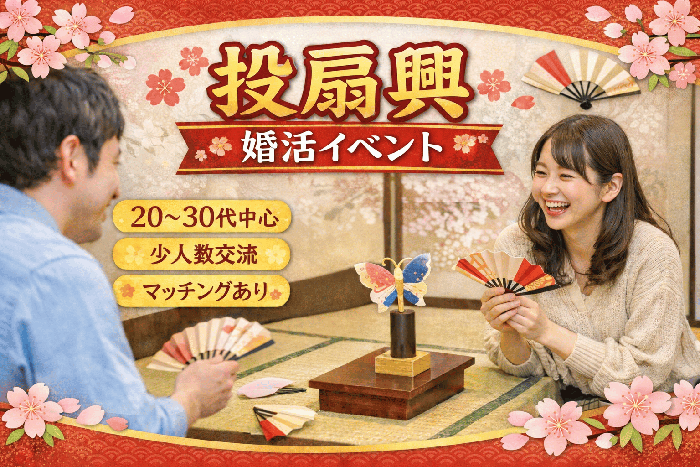 扇子を投げる江戸時代の遊び投扇興(とうせんきょう)を楽しみながら交流する体験型イベントです。初対面だと何を話せばいいかわからないそんな方でも、ゲームを楽しみながらリラックスして交流できるイベントです。男女でグループになってゲームを行うため、自然と会話が生まれ、初参加の方やお一人参加の方でも安心してご参加いただけます。お友達との参加もOKイベントの最後にはマッチングタイムを行い、気になるお相手とのご縁をつなぐ機会をご用意しています。ゲームの結果に応じてプレゼントもご用意していますので、ぜひ楽しみ...