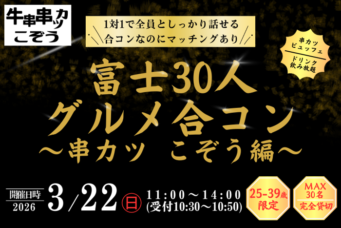 ビュッフェ料理ソフトドリンク付富士市の人気店串カツこぞうで、ちょっと贅沢な出会いを。サクサク揚げたての串カツや美味しい料理を楽しみながら、肩肘張らずに自然と会話が弾む大人の合コンをお楽しみいただけますお席は安心の個室だから、周りを気にせず思いきり楽しめる()食べて、話して、笑って気づけば距離もぐっと近づくひと時を。。会場は貸し切りですマッチング形式のパーティーです男女比率及び人数についてグルメ合コンは男女比率を調整して開催しています(1:13:2の比率)最大人数は合計35名程度となります。必ずしも男女同...