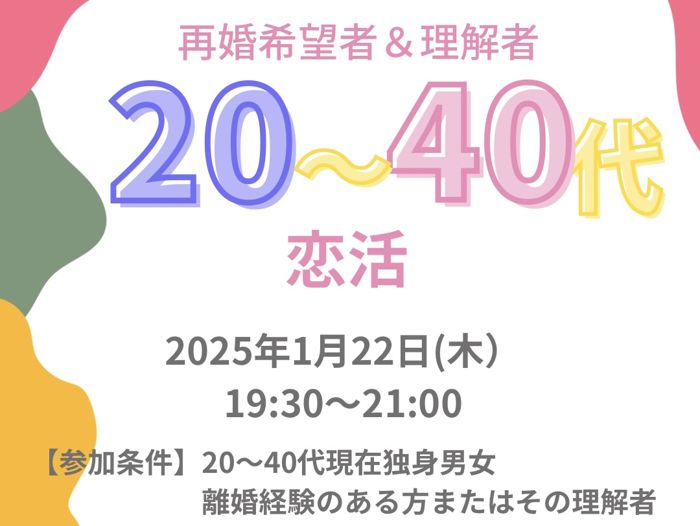 再婚希望者理解者の恋活2040代限定もう一度、ちゃんと向き合える人と出会いたい過去も含めて、理解し合える関係を築きたいそんな想いを持つ方のための、落ち着いた雰囲気の恋活イベントです。今回の参加条件は離婚経験のある方もしくは、その立場を理解できる方無理に踏み込まない、でもちゃんと話せる。大人の距離感を大切にしています。イベントは少人数制。司会進行は主催がすべて担当し、最初は緊張していた参加者の表情もアイスブレイクをきっかけに少しずつやわらいでいきます。何を話したらいいかわからないそんな方のために、...