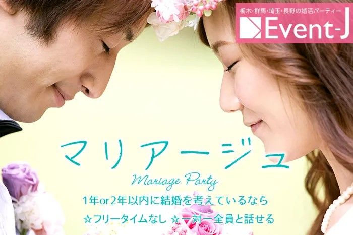 30代40代マリアージュ編2年以内に結婚希望ゆっくりとお話しする事ができるスタイルで素敵な異性とお洒落で優雅なパーティーを開催しています。おすすめポイント素敵なパートナーと出会いたい気軽にお友達から始めたいお一人でのご参加70以上連絡先交換は自由で安心してご参加いただけますフリータイム無しでお一人様でのご参加も安心ごあいさつ北関東を中心に毎月約80会場にて展開しているEvent-Jグループが婚活パーティー街コンを開催毎回、大勢の方との真面目な出会いのコミュニティとして評判をいただいています。恋活、婚活、友達...