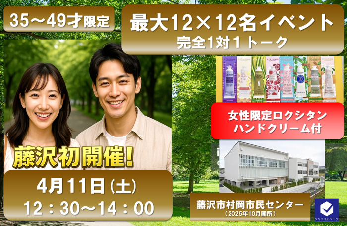 落ち着いて話せる大人の恋活イベント女性早期お申込み特典ロクシタンハンドクリームをプレゼント数量限定早期申込みの方対象全員対象その場で当たる景品抽選会もご用意しています35才49才限定大人の恋活イベント落ち着いた空間で、ゆっくり会話を楽しみながら、自然なご縁を見つけてみませんかしっかり会話ができる緊張しにくい進行初参加お一人参加でも安心と、大人世代に好評のイベントですもちろん、お一人でのご参加も大歓迎です開催場所藤沢市村岡市民センター第一談話室2025年10月に開所した新しい施設です開催時間12301500終了...