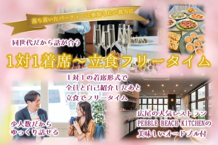 前半は着席して1対1で自己紹介していただき、後半はオードブルを召し上がりながら自由にお話して連絡先を交換していただきます。