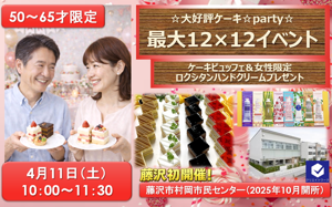 4月11日(土)10:00〜11:30 【藤沢市】 『超早割中』【藤沢・初開催・ケーキParty】☆★最大24名☆★50才~65才の恋活イベント!(女性限定・早期申込特典)