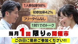 お一人での参加率98初参加率42カップリング率46連絡先交換率79年間70000人以上が参加する婚活パーティー。お一人で参加されることを考えたスタイルで、98の方がお一人で参加されています。真剣に婚活されている方だけを対象とした小規模な婚活イベントで、空いた時間を利用してお気軽に婚活が可能です。よくある質問Q服...