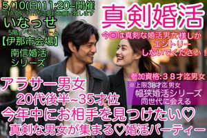 4月19日(日)10:30〜11:30 【伊那市】 開催確定!男性、女性残り僅か!【*男性25〜35歳・女性20〜37歳が参加するパーティー! in 伊那】