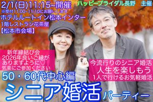 1月25日(日)15:00〜16:30 【長野市】 【女性無料ご招待/長野市】個室Style│誠実な方限定の婚活パーティー【お一人での参加率98%】