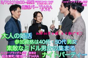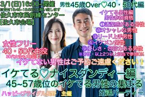 3月1日(日)16:00〜17:45 【佐久市】 【佐久市会場】ナイスダンディー編《男45~57歳位♡女フリー40・50代》45~57歳位のイケてる男性が集まる婚活パーティー