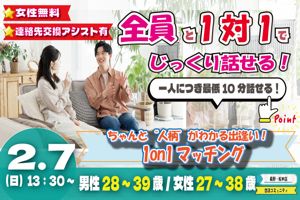 2月7日(土)11:00〜12:30 【松本市】 【女性無料ご招待/松本市】個室Style│誠実な方限定の婚活パーティー【お一人での参加率98%】
