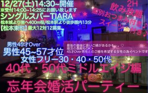 12月27日(土)14:30〜16:30 【松本市】 【婚活バーTIARA】男性45才Over《男性45~57才位vs女性フリー30・40・50代》忘年会婚活♡大人の飲み会婚活パーティ