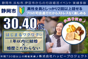 お菓子ドリンク付きしっかり会話をして、お相手の事を知っていくのもいいですねまずは楽しく会話ができるお茶友から()ハピプロ安心ポイント経験豊富なプロの司会進行でスマートなパーティーをお届け異性全員としっかり2回話せる男女バランスをしっかり調整こだわり空間(貸切)とこだわりのBGM静岡県(浜松市静岡市伊豆市等...