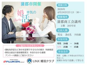 4月19日(日)13:30〜15:00 【蒲郡市】 令和8年4月19日開催 女性参加無料!25歳~38歳の同世代中心×1~2年以内の結婚に真剣な方へ 女性20代前半の方でもOK