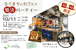 10月11日(土)12:00〜14:00 【奈良市】 【30代・40代限定】ならまちカフェで婚活パーティー