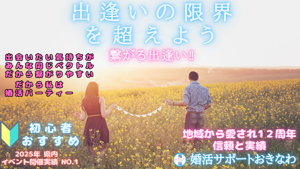 内容1対1の対面式お見合いです。会話が苦手な方も大丈夫。最初に簡単なプロフィールを記入して頂いてから始めますのでご安心下さい。プロフィールを元にお互いの趣味や休日の過ごし方などが分かるため、スムーズに会話に入っていけます。全員と会話が終わった後、最後に気になる異性をカップリング用紙に記入して頂きま...